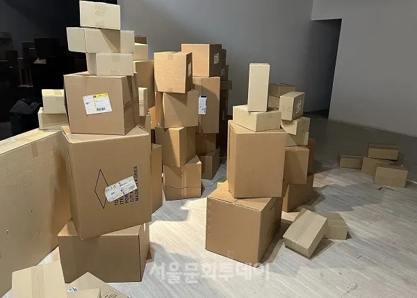 ▲<임시공간> 공간에서 <부유한 상자> 300X200X200cm, 종이박스, 테이프, 스피커, 2022. 김세은, 서민서(가상 예술가), 정찬민 (사진=MIVA 프로젝트 기획 제공)