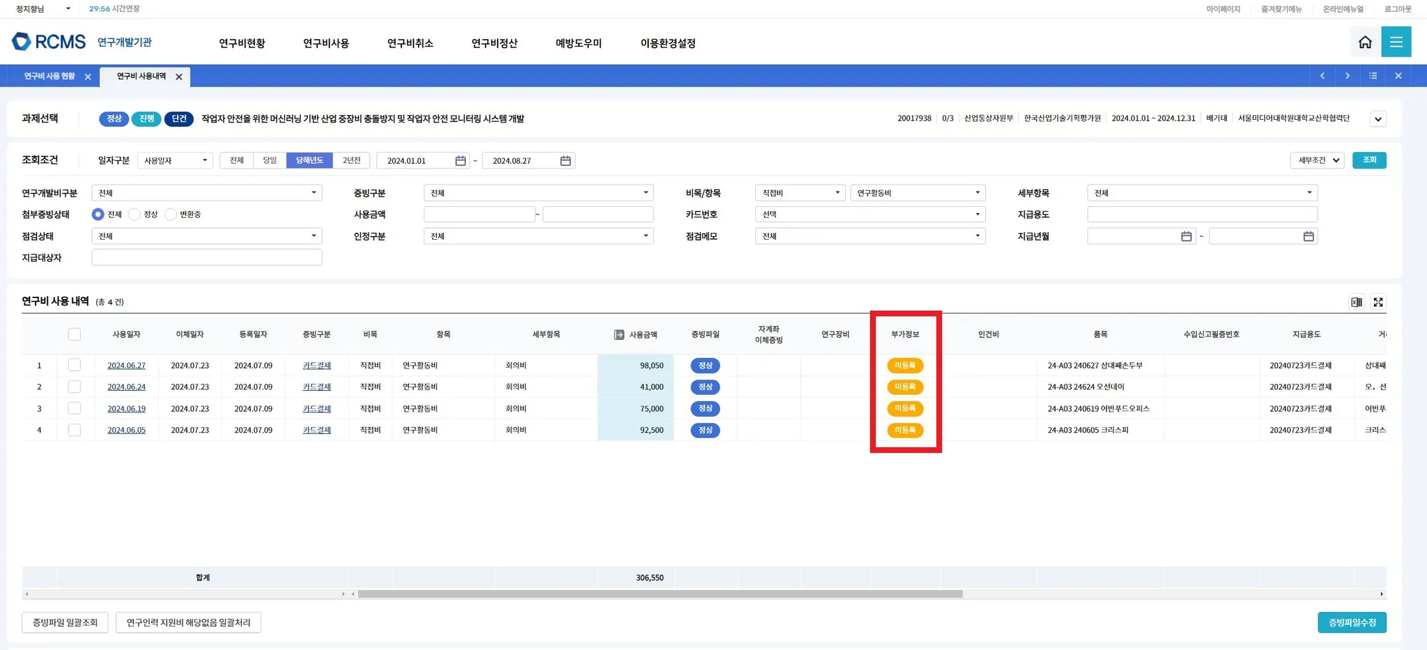 접속 - 연구비현황 - 연구비 사용내역 - 과제선택하고 조회