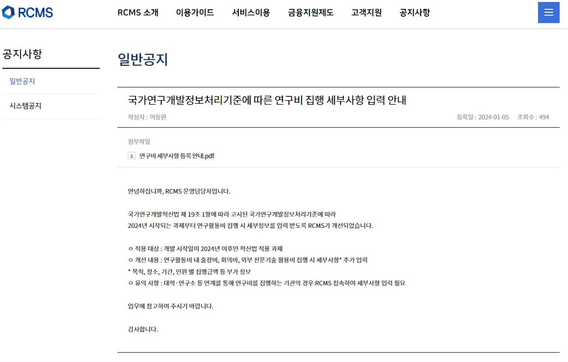 국가연구개발혁신법 제 19조 1항에 따라 고시된 국가연구개발정보처리기준에 따라 2024년 시작되는 과제부터 연구활동비 집행 시 세부정보를 입력 받도록 RCMS가 개선되었습니다.