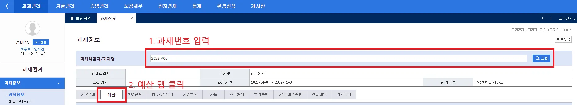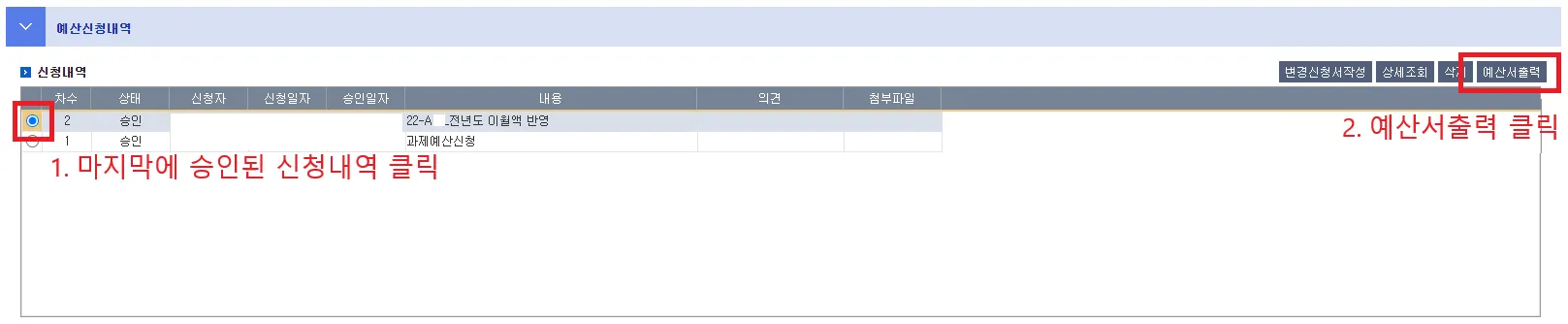 신청내역이 2건 이상인 경우 두번째 내역부터 ‘실행예산 변경 내역(n차)’로 출력