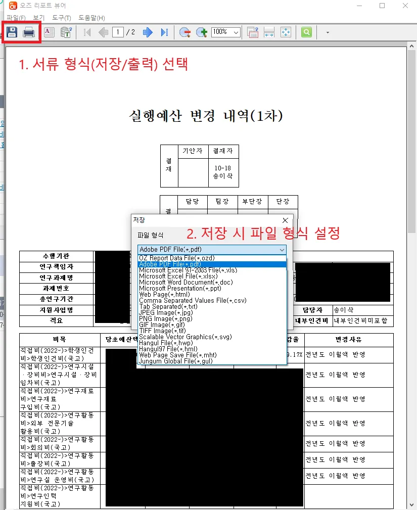 신청내역이 1건인 경우 ‘실행예산 승인 신청서’로 출력
