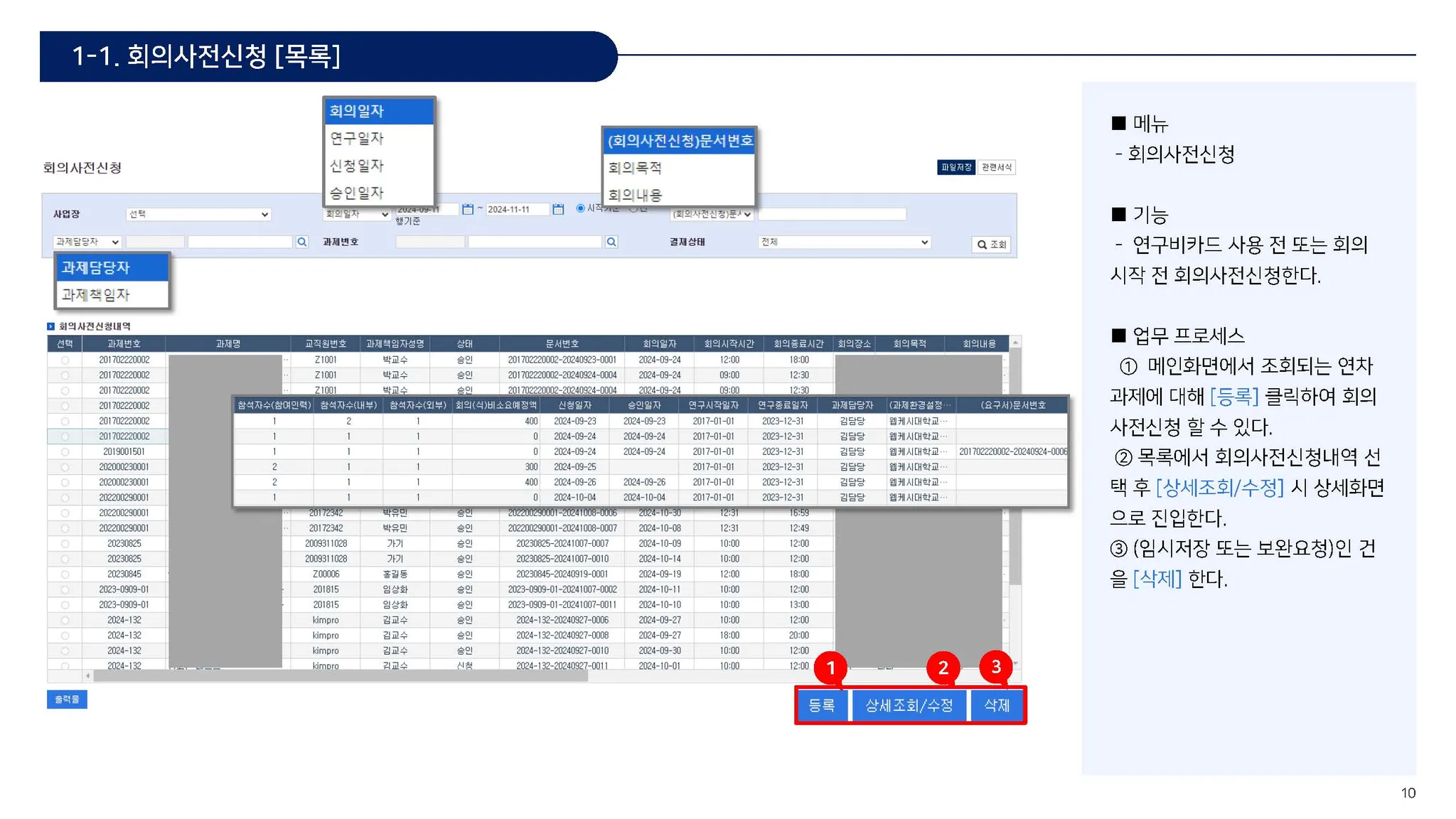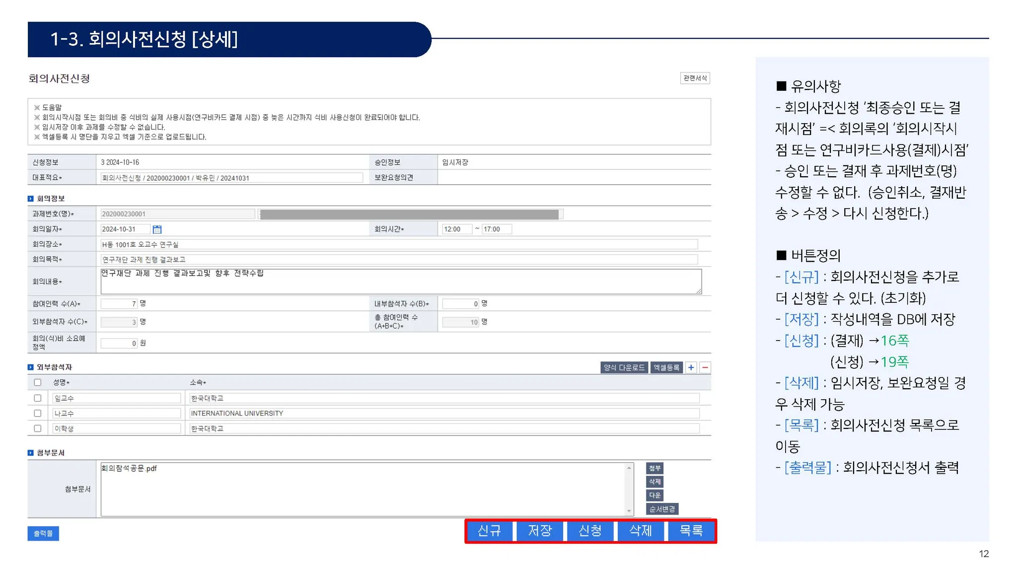 연구행정시스템(rERP)에 사전신청 하실수 있도록 ‘회의사전신청’ 메뉴가 개발되었습니다.