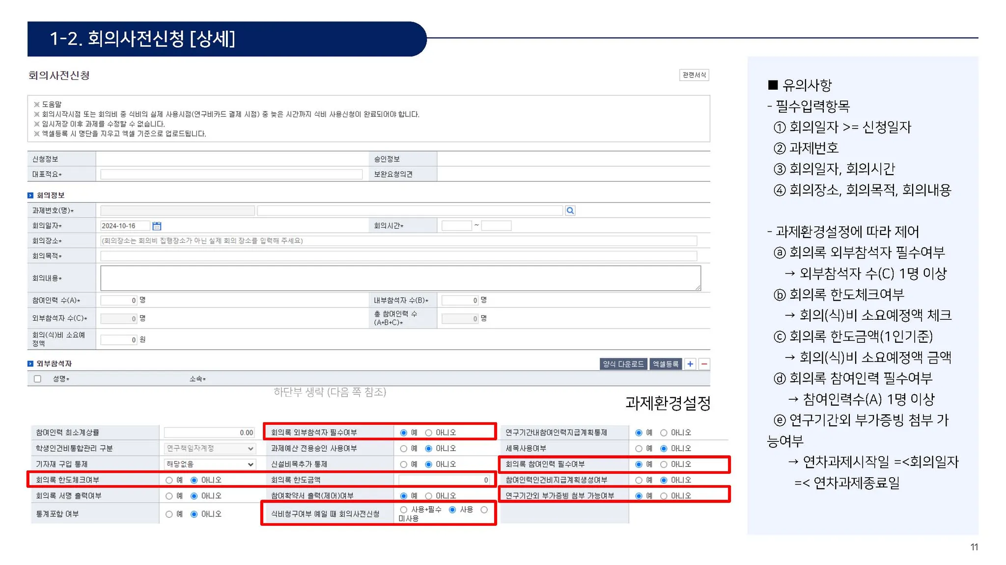 유예기간이 종료되는 2024.11.30. 이후 (2024.12.1.부터) 결제되는 연구비카드 - 회의비 증명자료로 사전 내부결재문서가 필수로 구비되어야 함